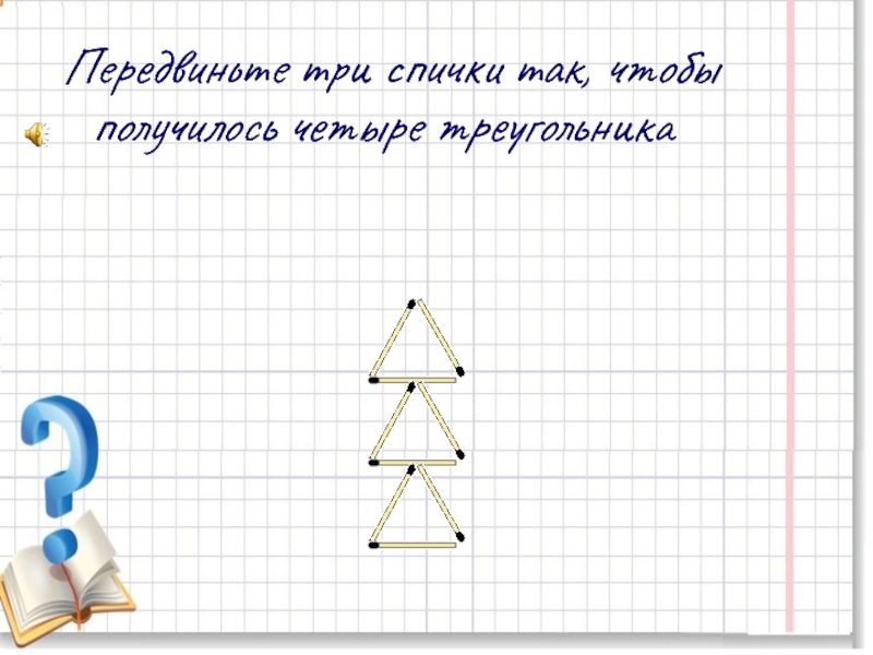 Слайд 9Передвиньте три спички так, чтобы получилось четыре треугольника