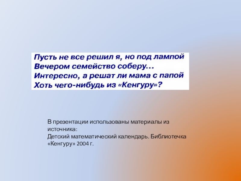 В презентации использованы материалы из источника:Детский математический календарь. Библиотечка «Кенгуру» 2004 г.