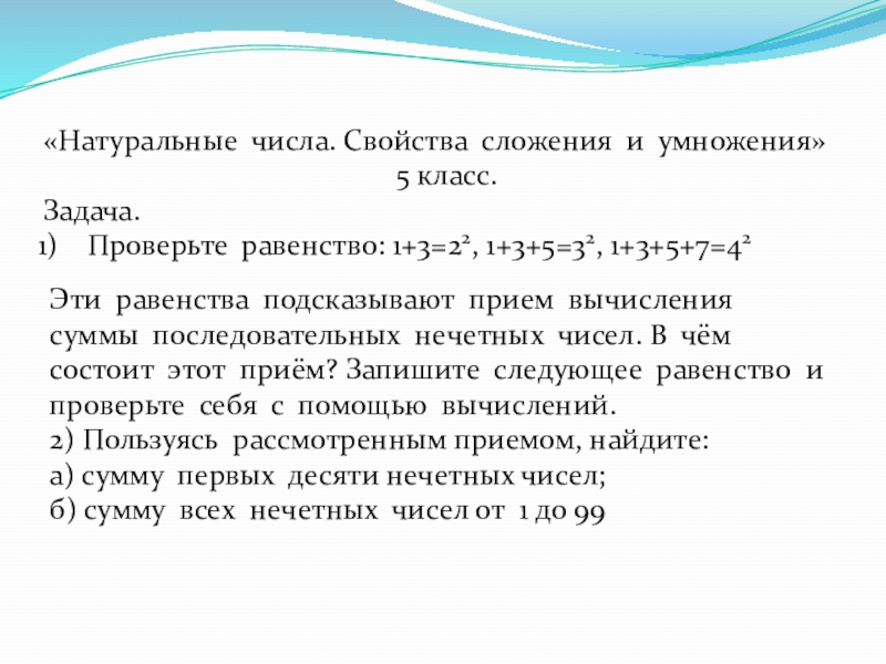 Эти равенства подсказывают прием вычисления суммы последовательных нечетных чисел. В чём состоит этот приём? Запишите следующее равенство и проверьте себя с помощью вычислений.