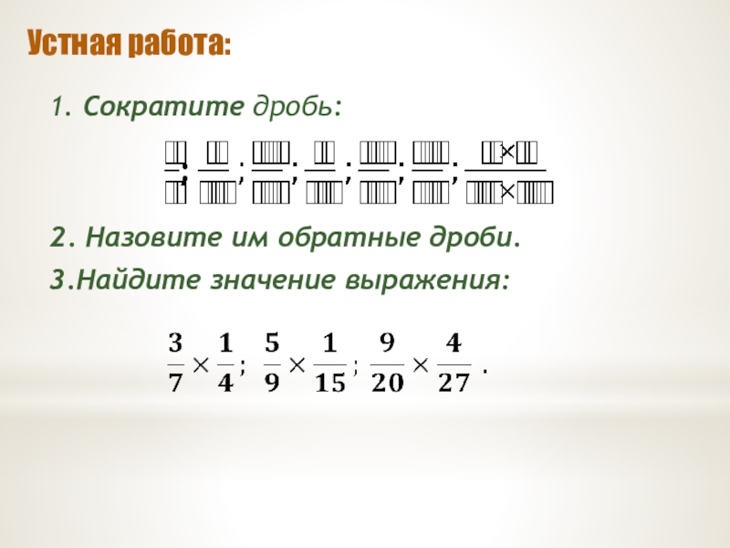 Устная работа:1. Сократите дробь:2. Назовите им обратные дроби.3.Найдите значение выражения: