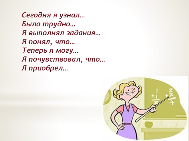 Сегодня я узнал…Было трудно…Я выполнял задания…Я понял, что…Теперь я могу…Я почувствовал, что…Я приобрел…