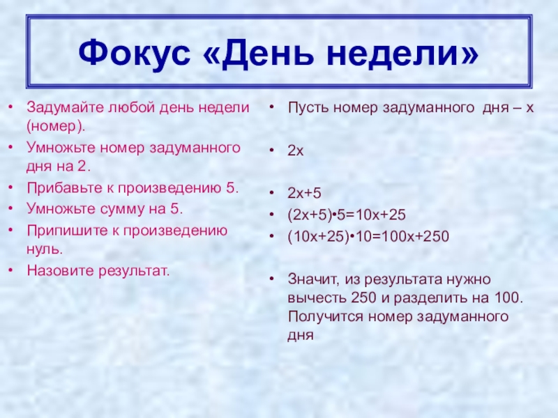 Значит, из результата нужно вычесть 250 и разделить на 100. Получится номер задуманного дня