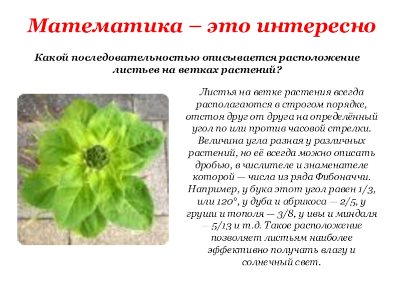 на ветке растения всегда располагаются в строгом порядке, отстоя друг от друга на определённый угол по или против часовой стрелки. Величина угла разная у различных растений, но её всегда можно описать дробью, в числителе и знаменателе которой — числа из ряда Фибоначчи. Например, у бука этот угол равен 1/3, или 120°, у дуба и абрикоса — 2/5, у груши и тополя — 3/8, у ивы и миндаля — 5/13 и т.д. Такое расположение позволяет листьям наиболее эффективно получать влагу и солнечный свет.