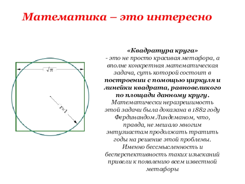 а вполне конкретная математическая задача, суть которой состоит в построении с помощью циркуля и линейки квадрата, равновеликого по площади данному кругу. Математически неразрешимость этой задачи была доказана в 1882 году Фердинандом Линдеманом, что, правда, не мешало многим энтузиастам продолжать тратить годы на решение этой проблемы. Именно бессмысленность и бесперспективность таких изысканий привели к появлению всем известной метафоры
