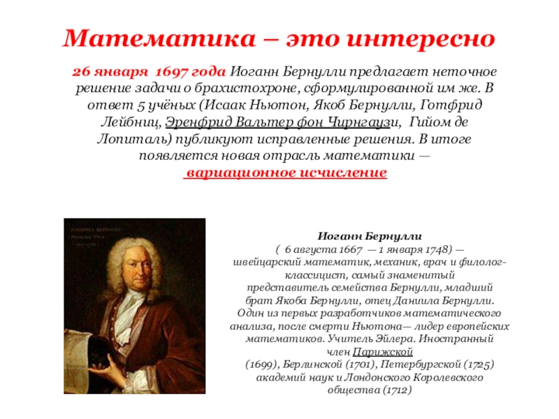 Слайд 426 января 1697 года Иоганн Бернулли предлагает неточное решение задачи о брахистохроне,