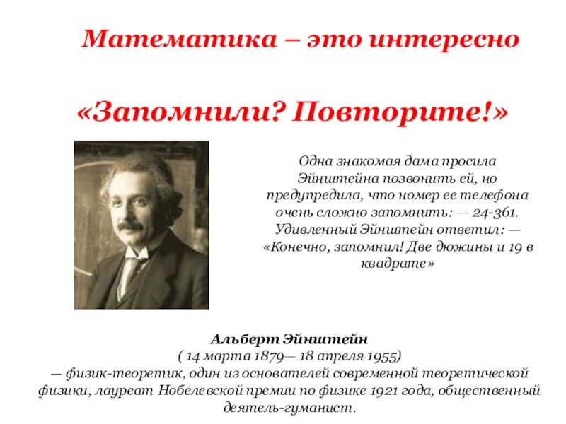 ей, но предупредила, что номер ее телефона очень сложно запомнить: — 24-361. Удивленный Эйнштейн ответил: — «Конечно, запомнил! Две дюжины и 19 в квадрате»