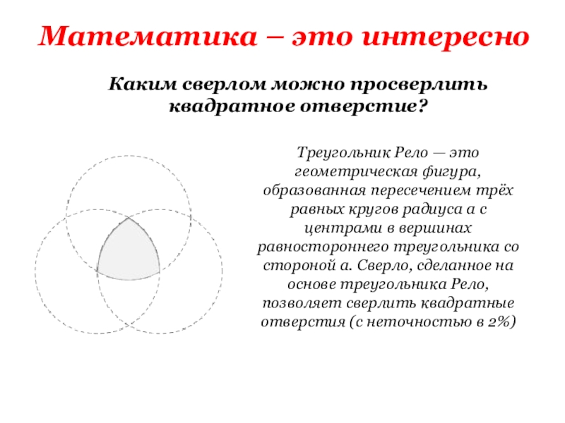 — это геометрическая фигура, образованная пересечением трёх равных кругов радиуса a с центрами в вершинах равностороннего треугольника со стороной a. Сверло, сделанное на основе треугольника Рело, позволяет сверлить квадратные отверстия (с неточностью в 2%)