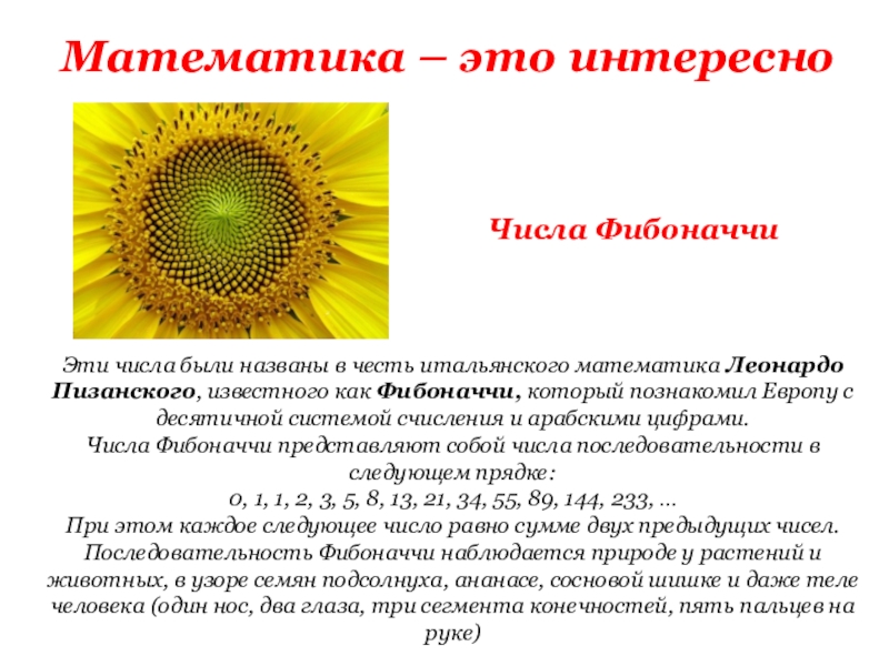 Последовательность Фибоначчи наблюдается природе у растений и животных, в узоре семян подсолнуха, ананасе, сосновой шишке и даже теле человека (один нос, два глаза, три сегмента конечностей, пять пальцев на руке)
