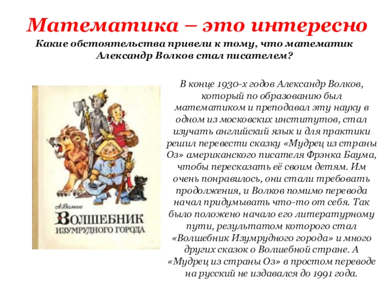 В конце 1930-х годов Александр Волков, который по образованию был математиком и преподавал эту науку в одном из московских институтов, стал изучать английский язык и для практики решил перевести сказку «Мудрец из страны Оз» американского писателя Фрэнка Баума, чтобы пересказать её своим детям. Им очень понравилось, они стали требовать продолжения, и Волков помимо перевода начал придумывать что-то от себя. Так было положено начало его литературному пути, результатом которого стал «Волшебник Изумрудного города» и много других сказок о Волшебной стране. А «Мудрец из страны Оз» в простом переводе на русский не издавался до 1991 года.