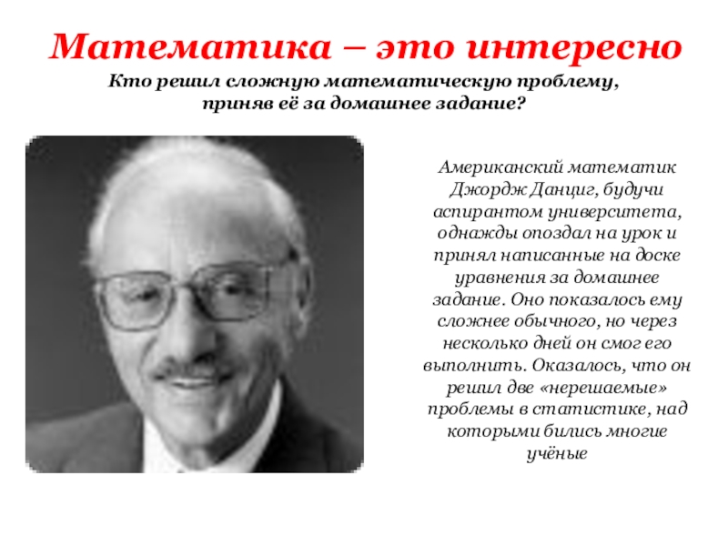 Американский математик Джордж Данциг, будучи аспирантом университета, однажды опоздал на урок и принял написанные на доске уравнения за домашнее задание. Оно показалось ему сложнее обычного, но через несколько дней он смог его выполнить. Оказалось, что он решил две «нерешаемые» проблемы в статистике, над которыми бились многие учёные