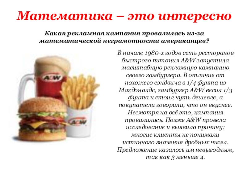 начале 1980-х годов сеть ресторанов быстрого питания A&W запустила масштабную рекламную кампанию своего гамбургера. В отличие от похожего сэндвича в 1/4 фунта из Макдоналдс, гамбургер A&W весил 1/3 фунта и стоил чуть дешевле, а покупатели говорили, что он вкуснее. Несмотря на всё это, кампания провалилась. Позже A&W провела исследование и выявила причину: многие клиенты не понимали истинного значения дробных чисел. Предложение казалось им невыгодным, так как 3 меньше 4.
