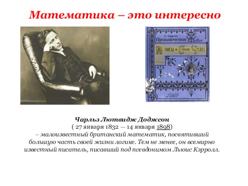 британский математик, посвятивший большую часть своей жизни логике. Тем не менее, он всемирно известный писатель, писавший под псевдонимом Льюис Кэрролл.