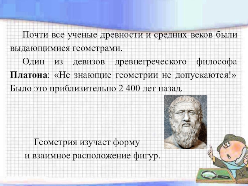 из девизов древнегреческого философа Платона: «Не знающие геометрии не допускаются!» Было это приблизительно 2 400 лет назад.