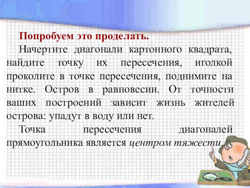 иголкой проколите в точке пересечения, поднимите на нитке. Остров в равновесии. От точности ваших построений зависит жизнь жителей острова: упадут в воду или нет.