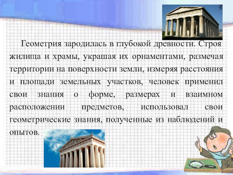 Слайд 5 Геометрия зародилась в глубокой древности. Строя жилища и храмы, украшая их