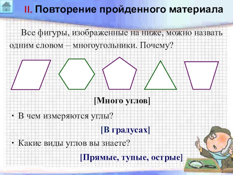 Замените в слове «многоугольник» «много» на любое число. Получим название геометрической фигуры. Обратите внимание, у этих фигур, сколько сторон, столько и углов.