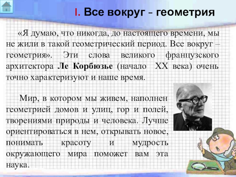 времени, мы не жили в такой геометрический период. Все вокруг – геометрия». Эти слова великого французского архитектора Ле Корбюзье (начало XX века) очень точно характеризуют и наше время.