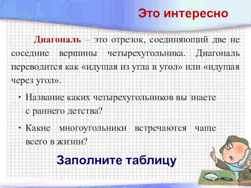 не соседние вершины четырехугольника. Диагональ переводится как «идущая из угла в угол» или «идущая через угол».