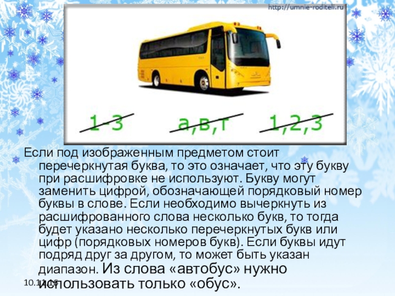 эту букву при расшифровке не используют. Букву могут заменить цифрой, обозначающей порядковый номер буквы в слове. Если необходимо вычеркнуть из расшифрованного слова несколько букв, то тогда будет указано несколько перечеркнутых букв или цифр (порядковых номеров букв). Если буквы идут подряд друг за другом, то может быть указан диапазон. Из слова «автобус» нужно использовать только «обус».