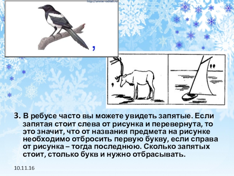 от рисунка и перевернута, то это значит, что от названия предмета на рисунке необходимо отбросить первую букву, если справа от рисунка – тогда последнюю. Сколько запятых стоит, столько букв и нужно отбрасывать.