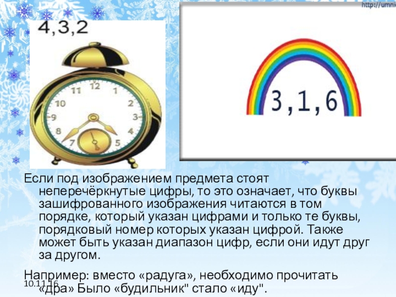 буквы зашифрованного изображения читаются в том порядке, который указан цифрами и только те буквы, порядковый номер которых указан цифрой. Также может быть указан диапазон цифр, если они идут друг за другом.