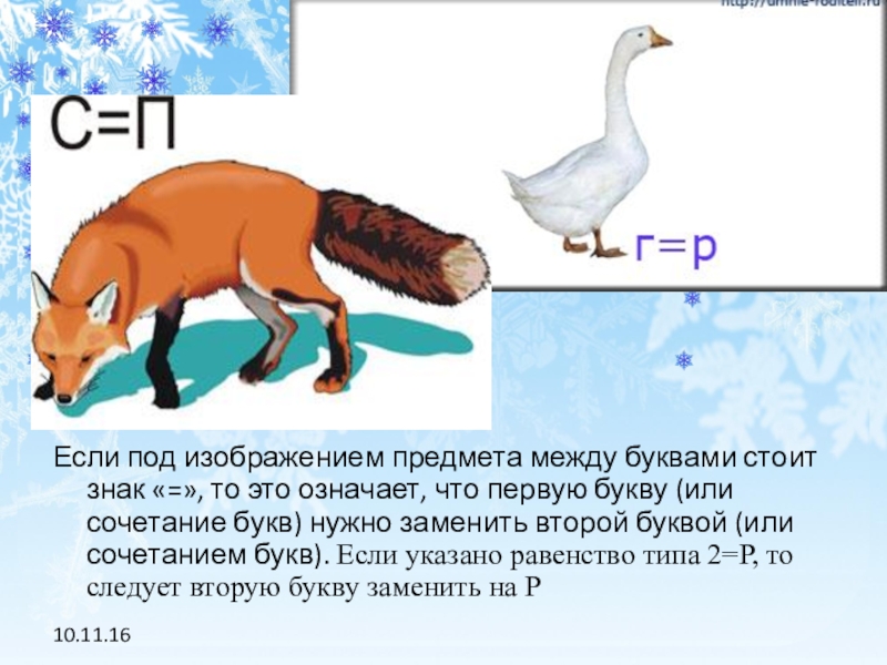 означает, что первую букву (или сочетание букв) нужно заменить второй буквой (или сочетанием букв). Если указано равенство типа 2=Р, то следует вторую букву заменить на Р