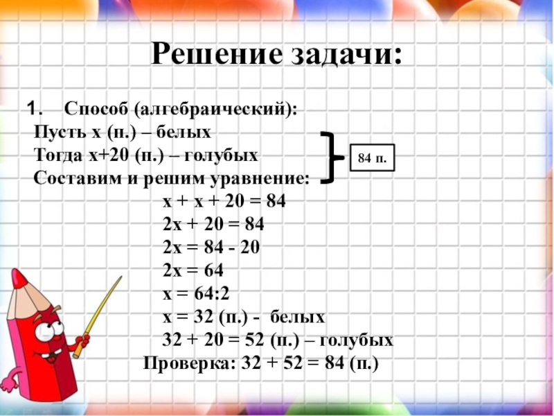 Проверка: 32 + 52 = 84 (п.)