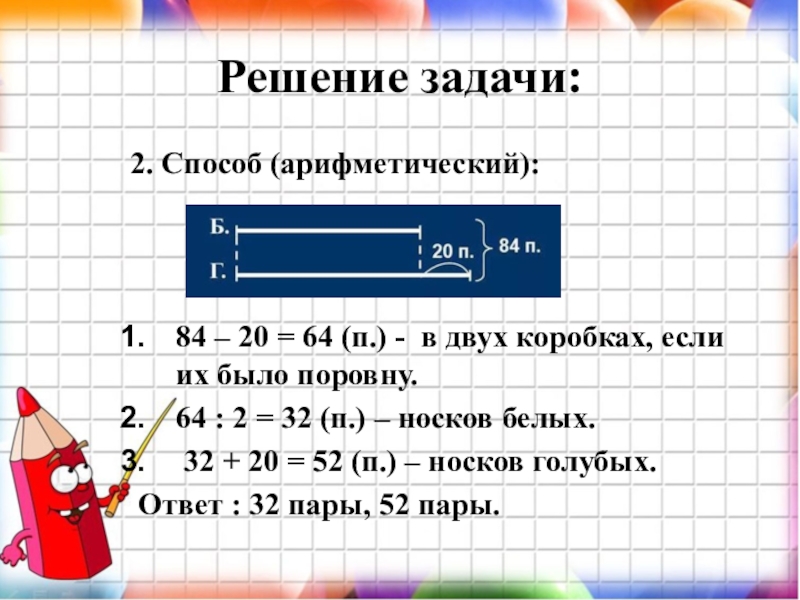 на 20 пар больше, чем белых. А всего в двух коробках 84 пары носков.