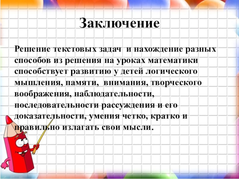уроках математики способствует развитию у детей логического мышления, памяти, внимания, творческого воображения, наблюдательности, последовательности рассуждения и его доказательности, умения четко, кратко и правильно излагать свои мысли.