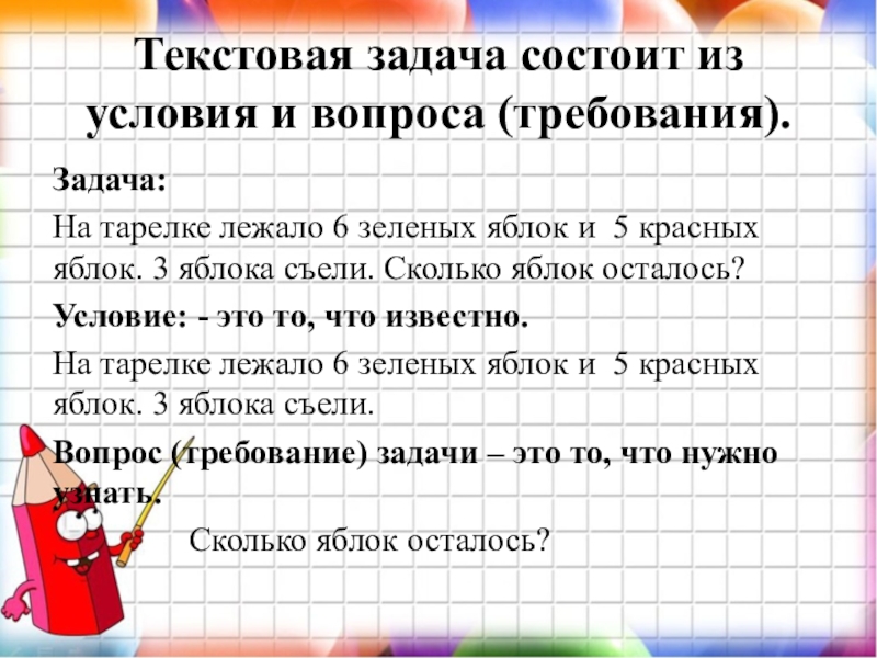 Слайд 7Текстовая задача состоит из условия и вопроса (требования).