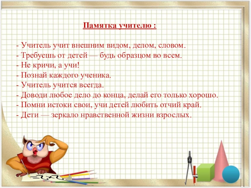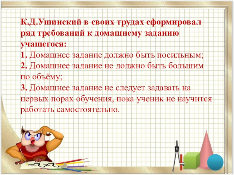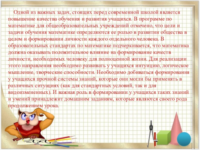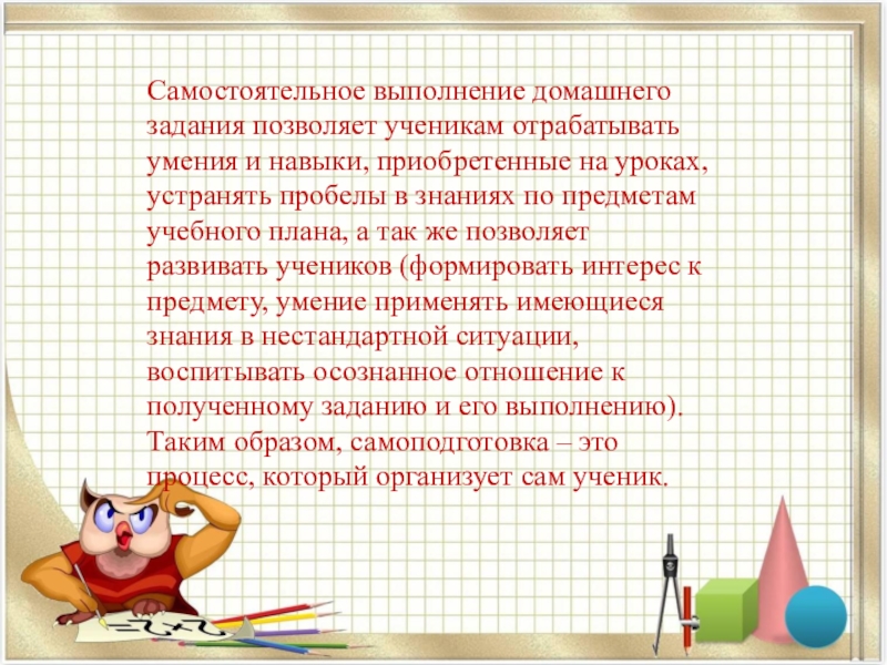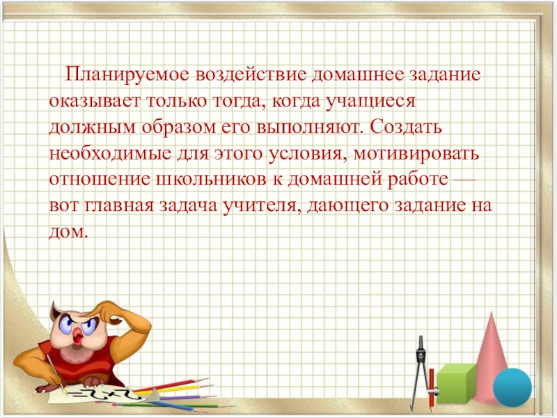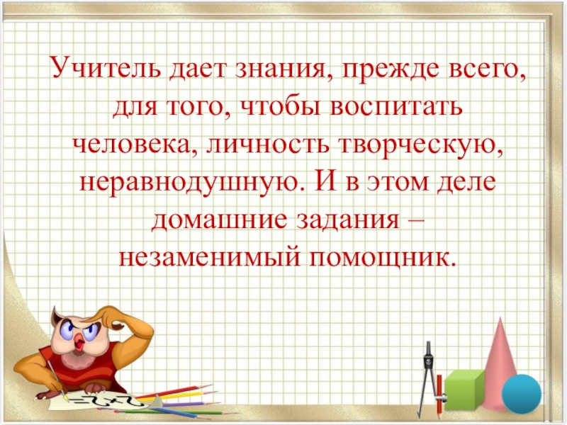Привычка к регулярной самостоятельной работе, выполнение заданий различной сложности — вот что относится к целям, которые мы преследуем, давая задание на дом.