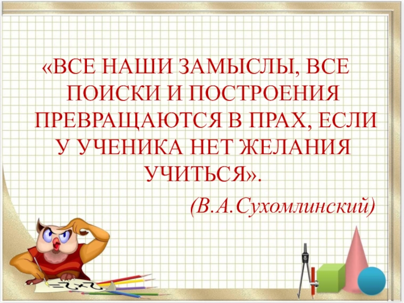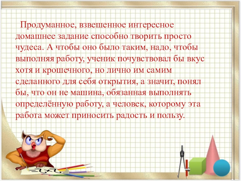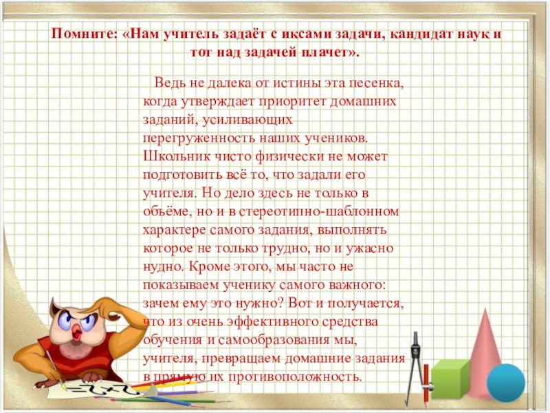 Ведь не далека от истины эта песенка, когда утверждает приоритет домашних заданий, усиливающих перегруженность наших учеников. Школьник чисто физически не может подготовить всё то, что задали его учителя. Но дело здесь не только в объёме, но и в стереотипно-шаблонном характере самого задания, выполнять которое не только трудно, но и ужасно нудно. Кроме этого, мы часто не показываем ученику самого важного: зачем ему это нужно? Вот и получается, что из очень эффективного средства обучения и самообразования мы, учителя, превращаем домашние задания в прямую их противоположность.
