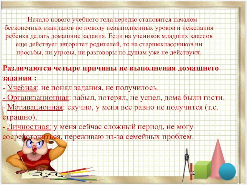 Начало нового учебного года нередко становится началом бесконечных скандалов по поводу невыполненных уроков и нежелания ребенка делать домашние задания. Если на учеников младших классов еще действует авторитет родителей, то на старшеклассников ни просьбы, ни угрозы, ни разговоры по душам уже не действуют.