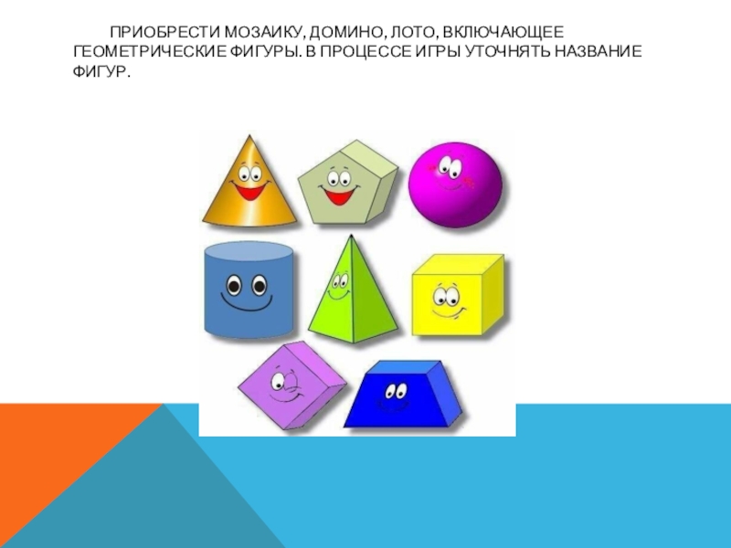 Слайд 14 Приобрести мозаику, домино, лото, включающее геометрические фигуры. В процессе игры уточнять