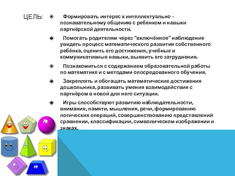 Помогать родителям через "включённое" наблюдение увидеть процесс математического развития собственного ребёнка, оценить его достижения, учебные и коммуникативные навыки, выявить его затруднения.