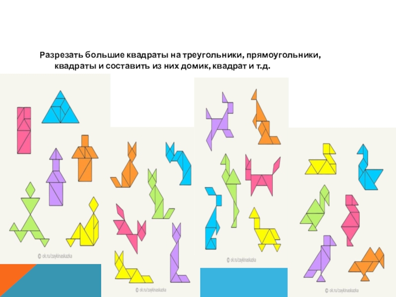 Разрезать большие квадраты на треугольники, прямоугольники, квадраты и составить из них домик, квадрат и т.д.