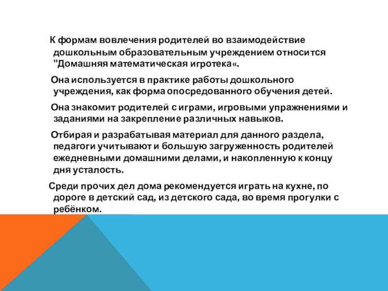 взаимодействие дошкольным образовательным учреждением относится "Домашняя математическая игротека«.