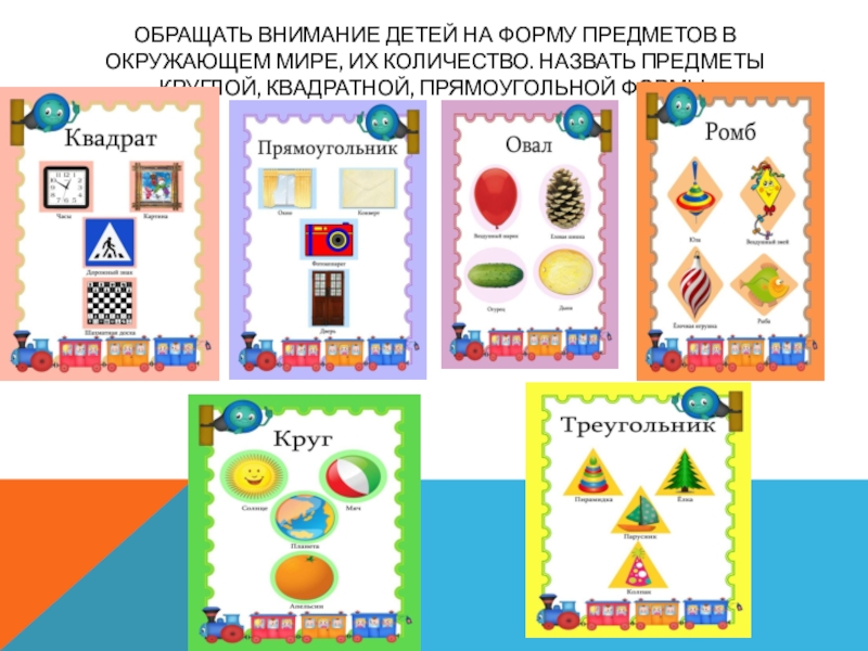Слайд 19Обращать внимание детей на форму предметов в окружающем мире, их количество.