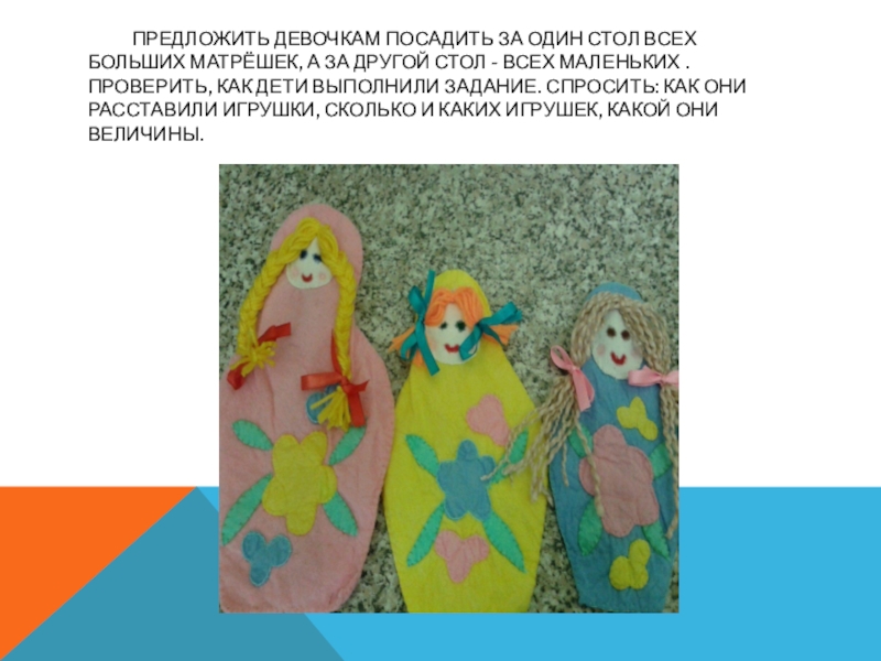 Слайд 15 Предложить девочкам посадить за один стол всех больших матрёшек, а за