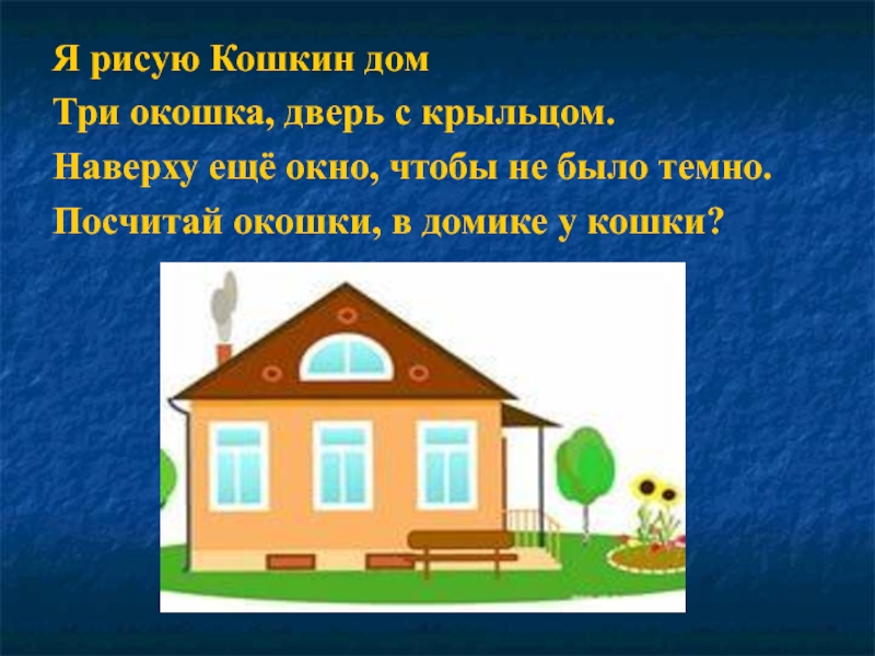 Я рисую Кошкин домТри окошка, дверь с крыльцом.Наверху ещё окно, чтобы не было темно.Посчитай окошки, в домике