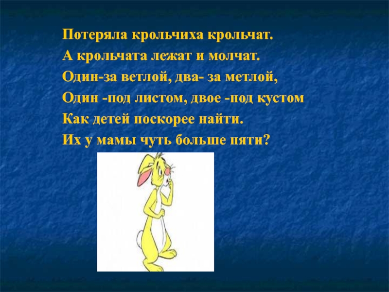 Потеряла крольчиха крольчат.А крольчата лежат и молчат.Один-за ветлой, два- за метлой, Один -под листом, двое -под кустомКак