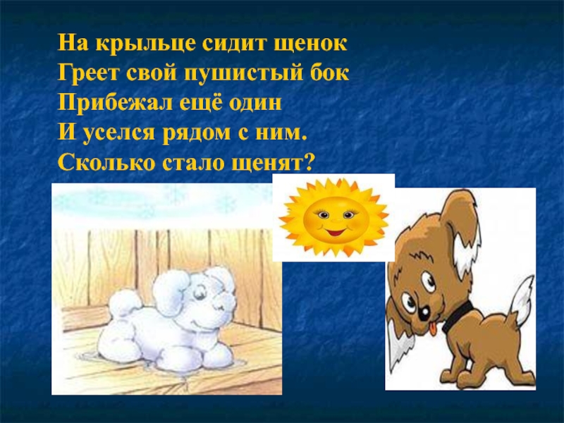 На крыльце сидит щенокГреет свой пушистый бокПрибежал ещё одинИ уселся рядом с ним.Сколько стало щенят?