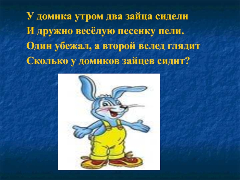 У домика утром два зайца сиделиИ дружно весёлую песенку пели.Один убежал, а второй вслед глядитСколько у домиков
