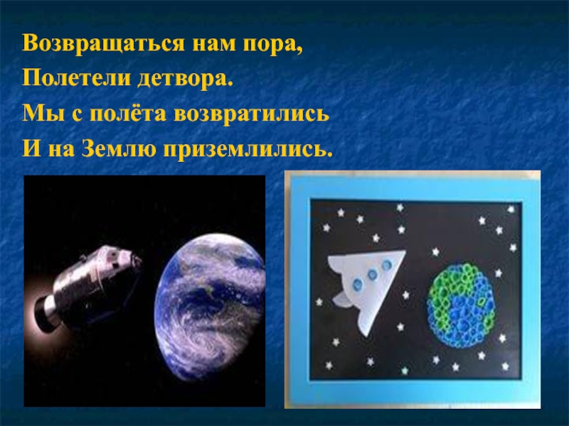 Возвращаться нам пора, Полетели детвора.Мы с полёта возвратилисьИ на Землю приземлились.
