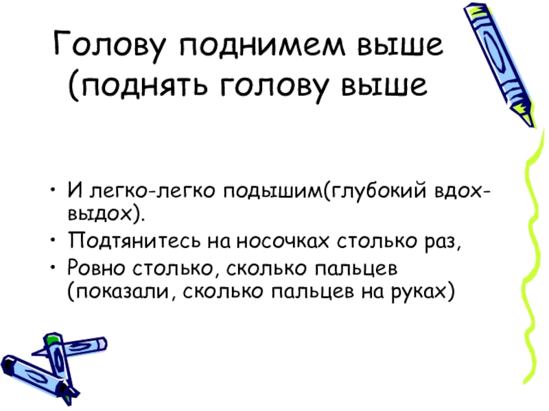 Голову поднимем выше(поднять голову вышеИ легко-легко подышим(глубокий вдох-выдох).Подтянитесь на носочках столько раз,Ровно столько, сколько пальцев(показали, сколько пальцев