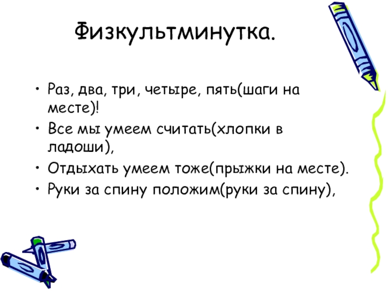 Физкультминутка. Раз, два, три, четыре, пять(шаги на месте)!Все мы умеем считать(хлопки в ладоши),Отдыхать умеем тоже(прыжки на месте).Руки