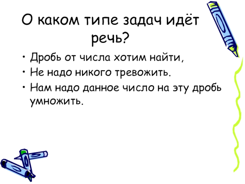 О каком типе задач идёт речь?Дробь от числа хотим найти,Не надо никого тревожить.Нам надо данное число на эту дробь умножить.