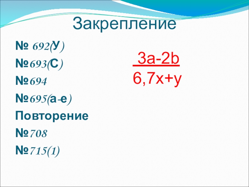 Закрепление № 692(У)№693(С)№694№695(а-е)Повторение№708№715(1) 3a-2b6,7x+y