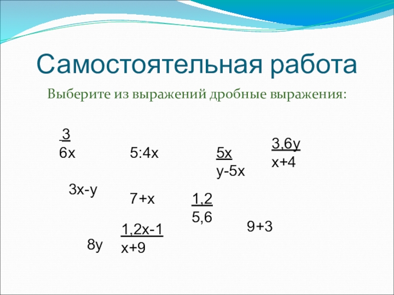 Самостоятельная работаВыберите из выражений дробные выражения: 36х3х-у5:4х1,25,63,6ух+41,2х-1х+95х у-5х9+37+х8у