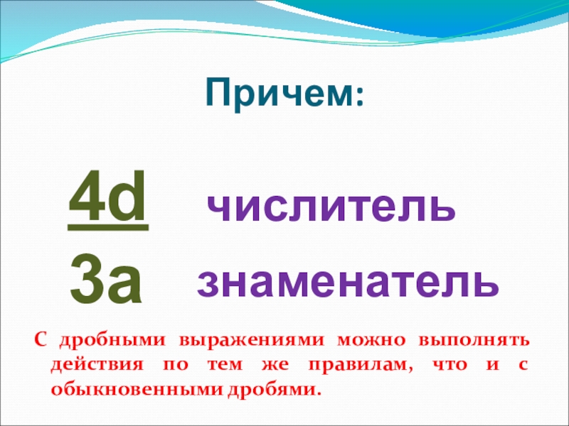 Причем:С дробными выражениями можно выполнять действия по тем же правилам, что и с обыкновенными дробями.4d3aчислительзнаменатель